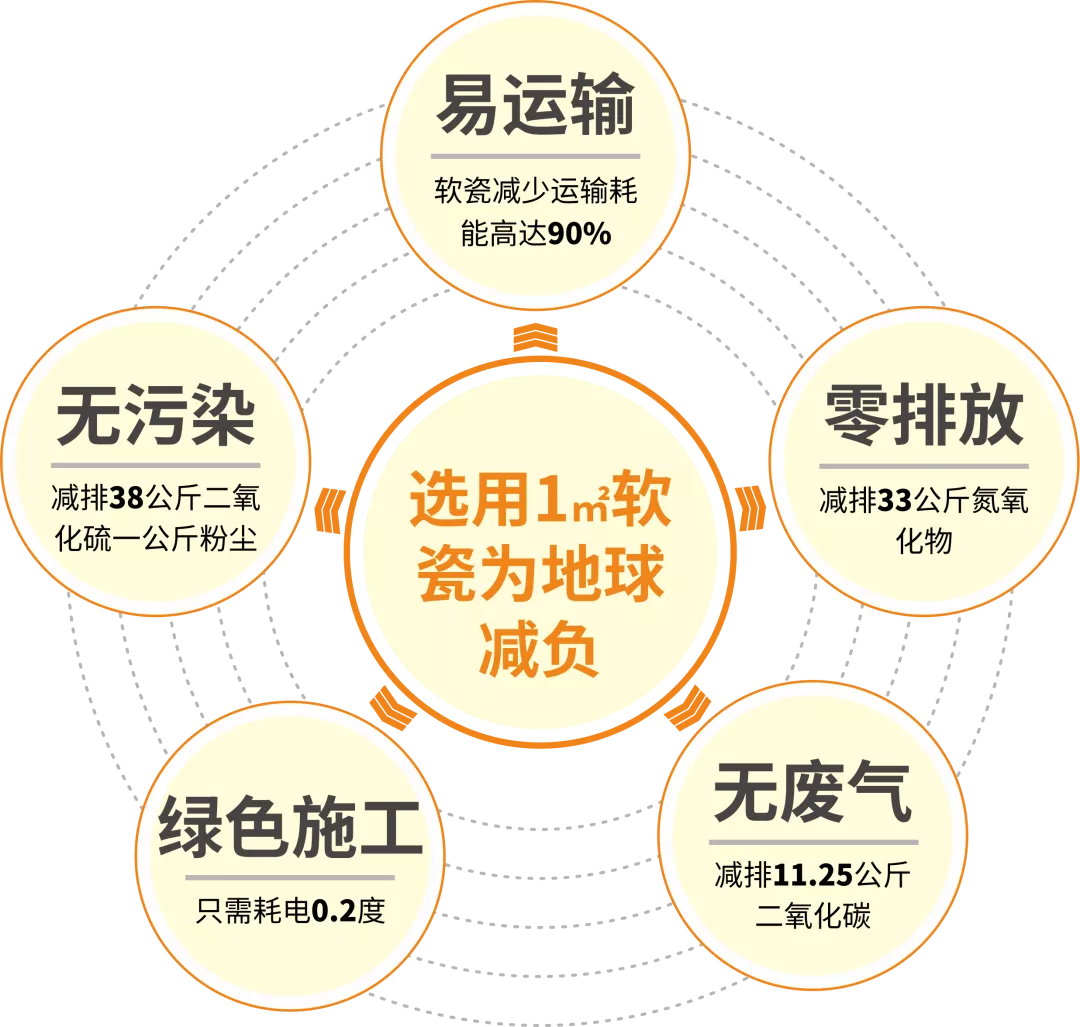 软瓷是由天然原料经过数道绿色生产工序制造出来。它采用了空气能与电能结合,生产时无“废水、废气、废渣”排放,每生产一平米软瓷片材,相比同类瓷砖节能80%以上,有效地减少建筑原材料与能源消耗,被视为最有前途的新型建筑材料之一。